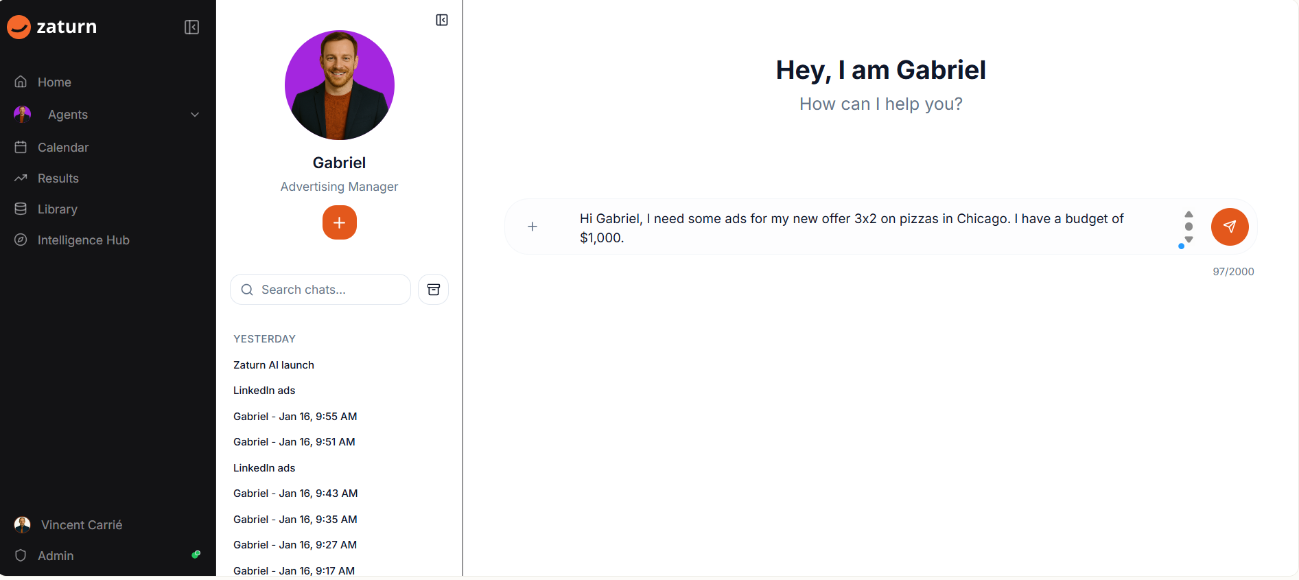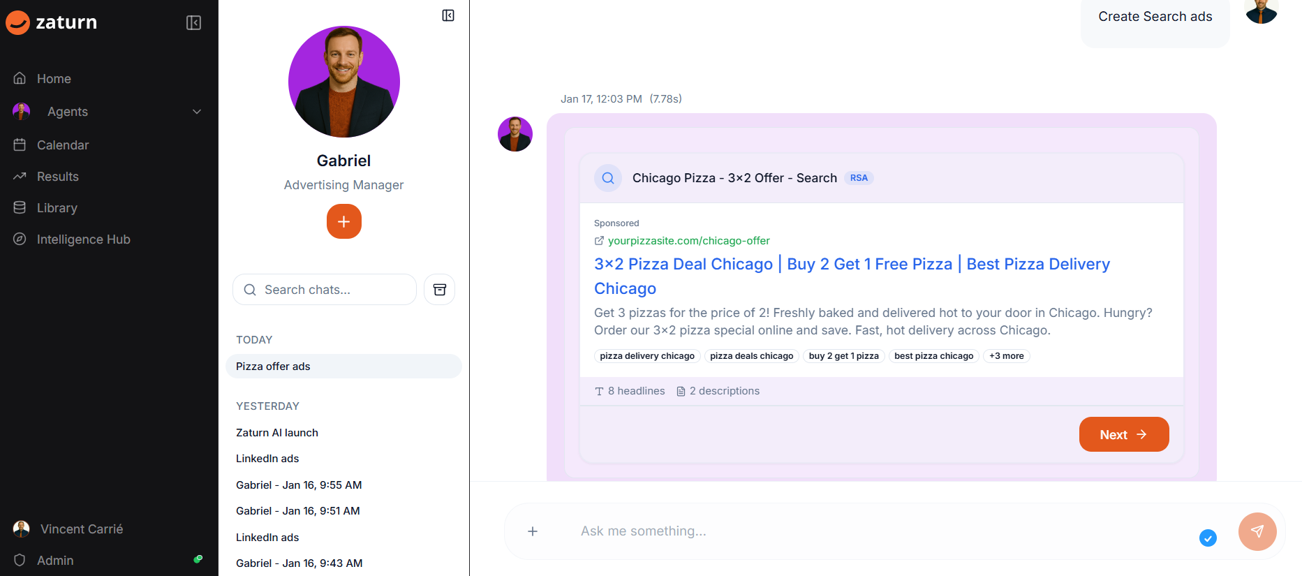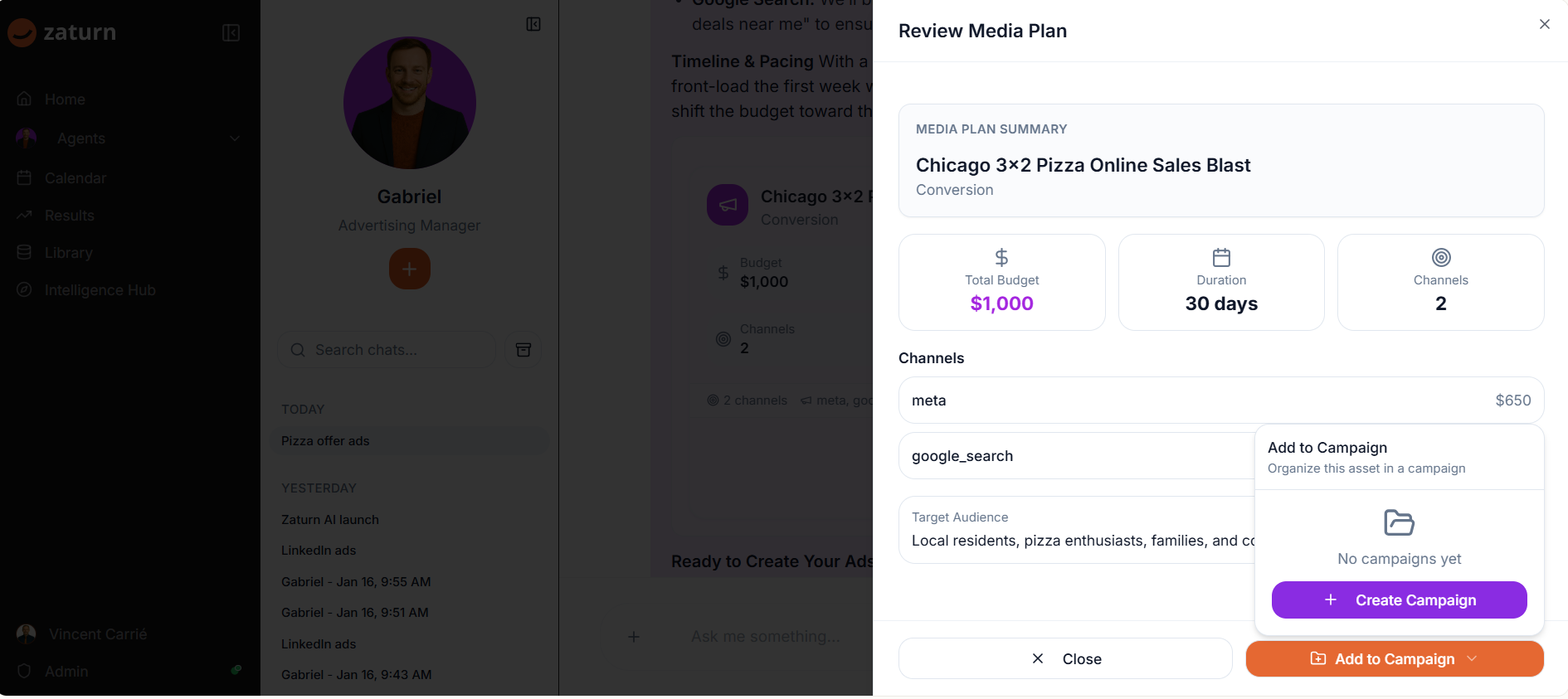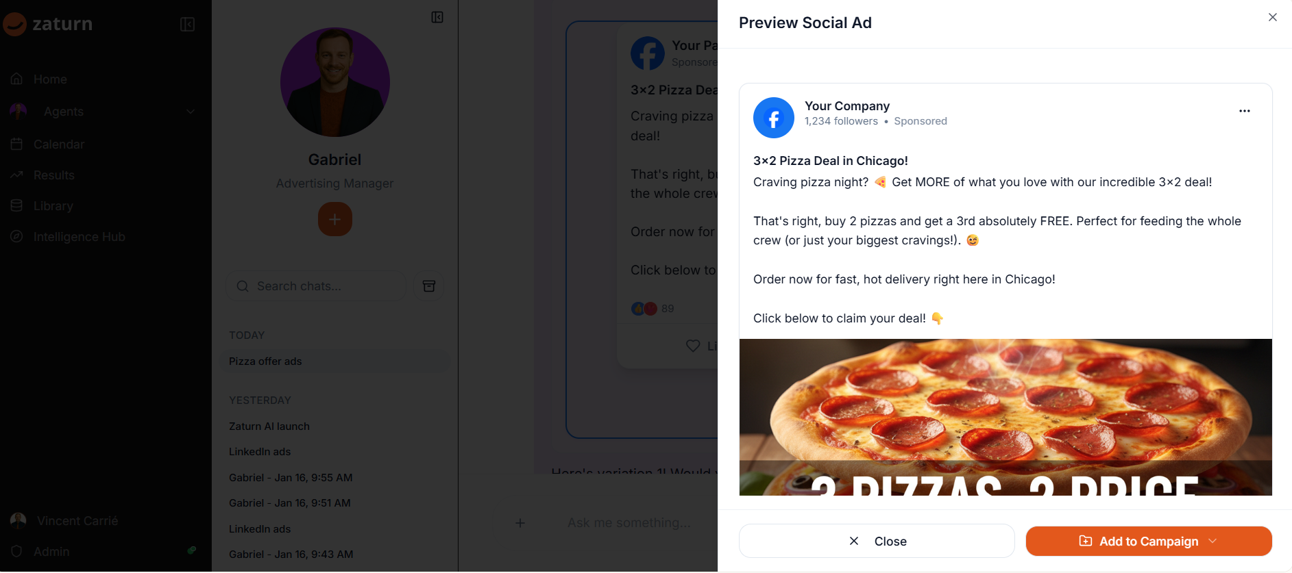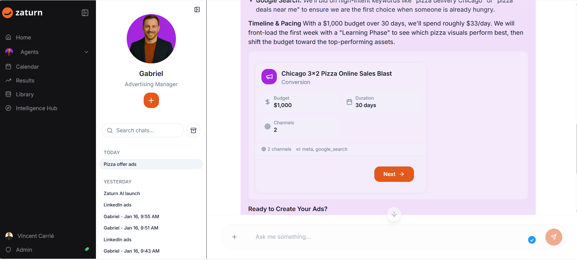 "Hi Gabriel, I need some ads for my new offer 3x2 on pizzas in Chicago. I have a budget of $1,000."