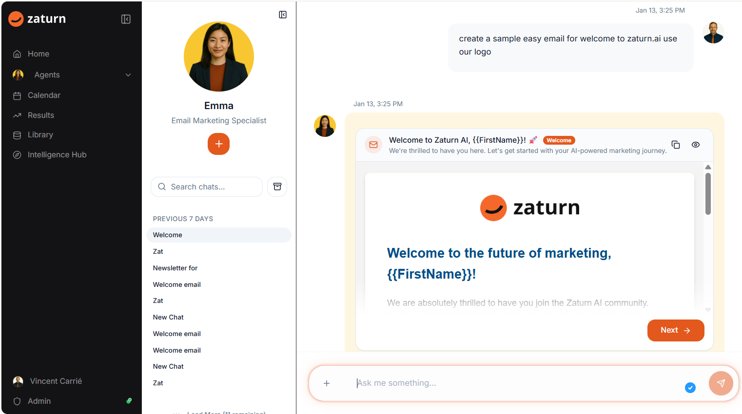 Chat with Emma and tell her what kind of email you need. Emma will engage in a discussion with you to create the perfect email. She's worked on thousands of campaigns and knows what gets opens and clicks.