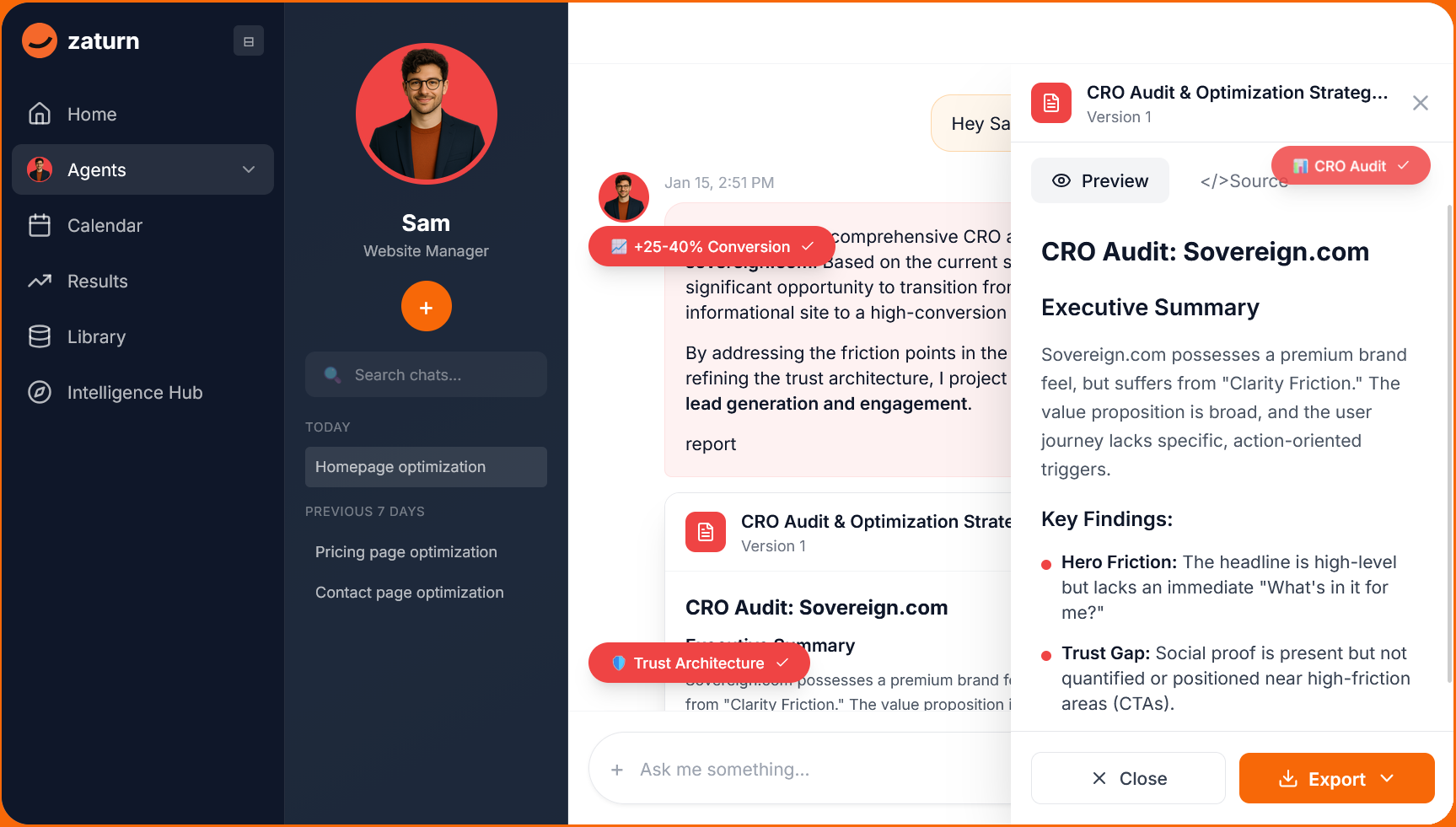 Sam's role is different from the other assistants. He's a conversion rate optimization (CRO) expert. He analyzes your website section by section, identifies exactly what's killing conversions, and delivers a step-by-step roadmap to fix them, complete with before/after mockups and projected conversion lift percentages for every recommended change.